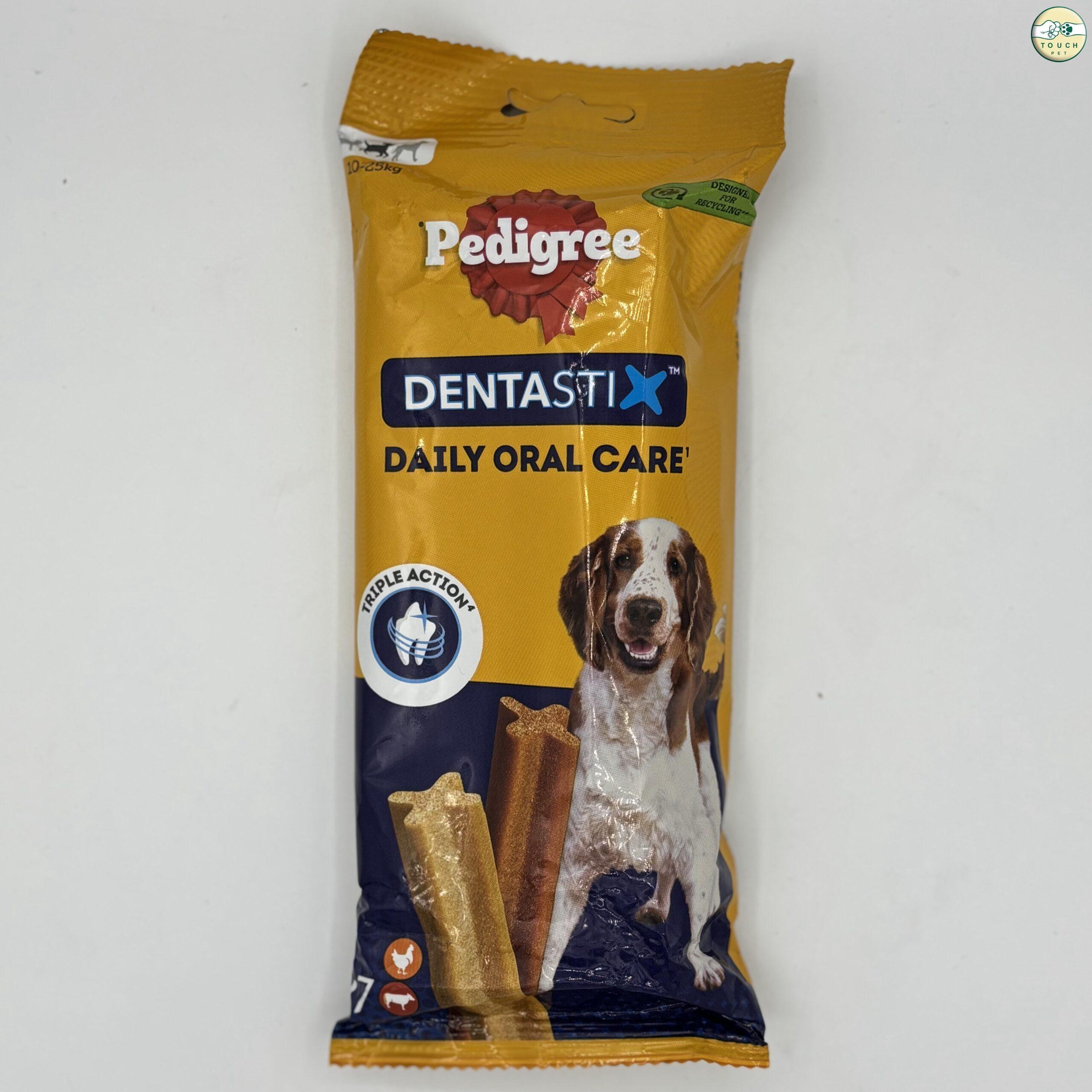 تشویقی دنتال پدیگری وزن ۲۷۰ گرم بسته ۷ عددی در دو طعم مرغ و گوشت به صورت میکس مناسب سگ بزرگتشویقی دندانی برای سگهای بالای 25 کیلوگرم که با طراحی شکل X به کاهش پلاک و جرم دندانها کمک میکند. با طعم مرغ واقعی، این محصول به بهبود بهداشت دهان و دندان سگها و تازه نگه داشتن نفس آنها کمک میکند.