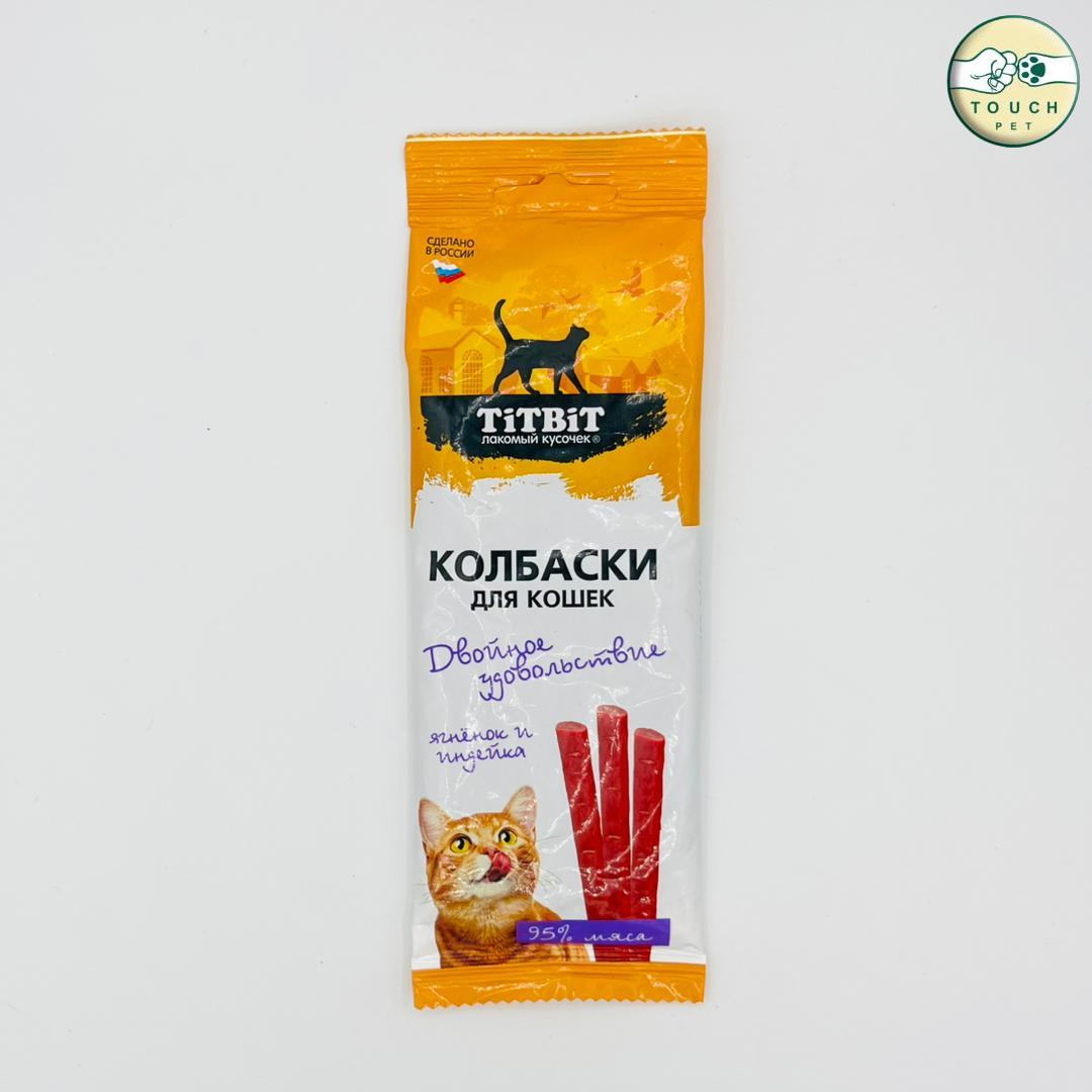 سوسیس گربه دابل دیلایت تیت بیت با طعم گوشت بره و بوقلمون وزن 45گرمTIT BIT Double Delight Cat Sausage – Lamb & Turkey Flavorسوسیس گربه TIT BIT Double Delight با طعم گوشت بره و بوقلمون، میانوعدهای خوشمزه و مقوی برای گربههاست. این تشویقی titbit گربه از ترکیب گوشت طبیعی بره و بوقلمون تهیه شده و ارزش غذایی بالایی دارد.