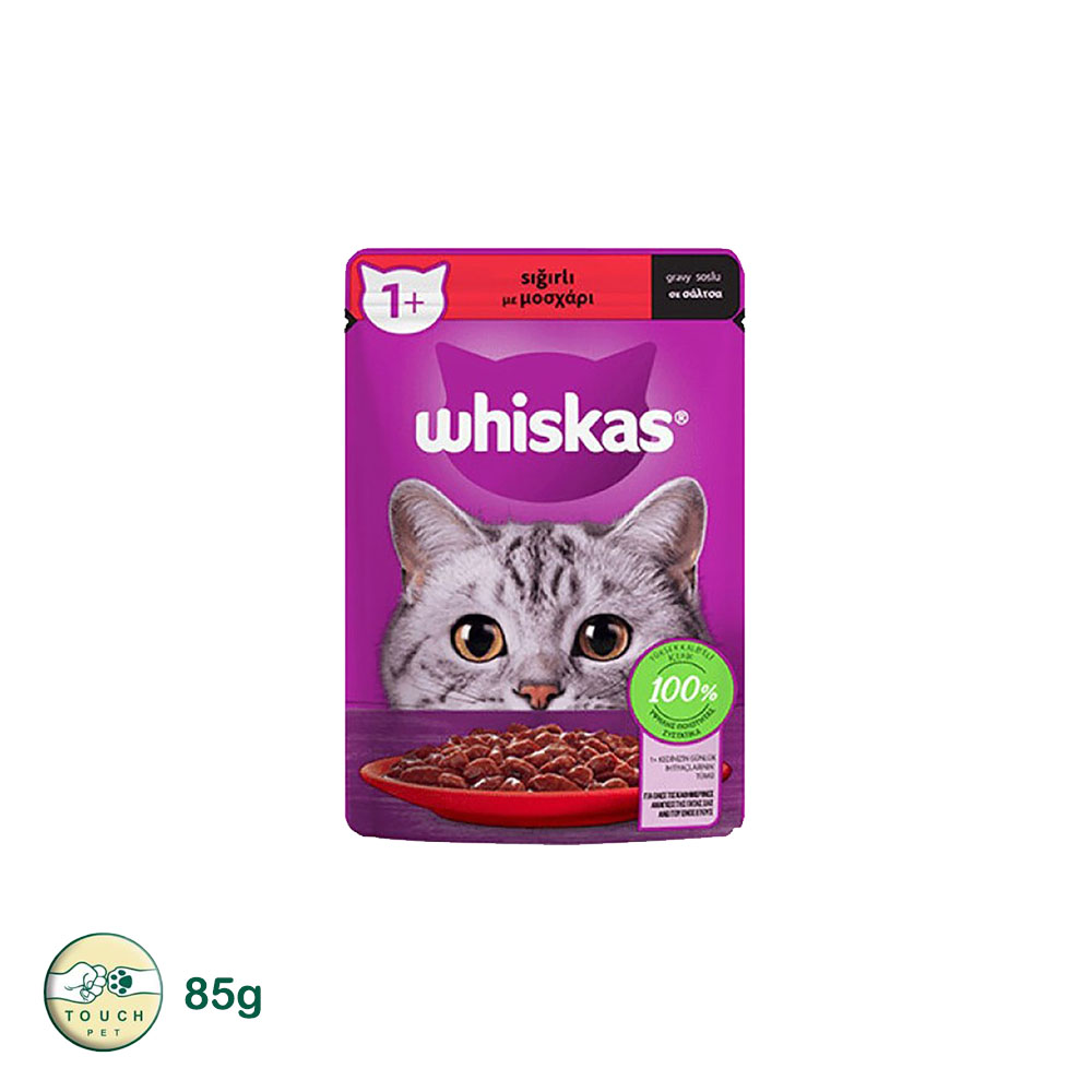 پوچ گربه ویسکاس طعم گوشت گاو Whiskas Cat Wet Food Beef Flavor وزن 85 گرم- مناسب انواع نژاد گربه