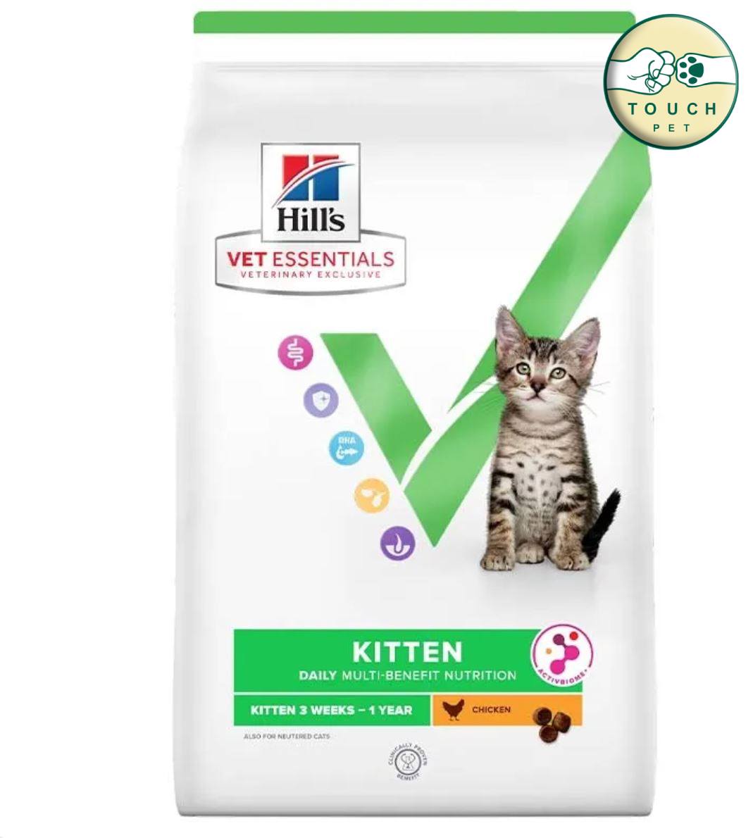 غذای خشک بچه گربه هیلز با طعم مرغ 3 کیلوگرم مدل Multi Benefitغذای خشک بچه گربه هیلز با طعم مرغ مدل مولتی بنفیت (Hills Vet Essentials Kitten Multi-Benefit Chicken)، با استفاده از ترکیبی منحصربفرد از آنتی اکسیدانها و همچنین با استفاده از فناوری ActivBiome+ برای حمایت از میکروبیوم روده فرموله شدهاست. همچنین یک وعدهی غذایی کامل، مقوی و سرشار از انرژی به شمار میآید. بافت جذاب این غذای خشک هیلز موجب ترغیب بچه گربههای بازیگوش به جویدن آن میگردد، که به این ترتیب جرم و پلاکهای تشکیل شده بر سطح دندانها را از بین میبرد. این محصول حاوی مقدار قابل توجهی امگا ۶ و ویتامین E است که موجب تقویت سیستم ایمنی، پوست و مو میشود. غذای خشک گربه هیلز از مرغ تازه و ارگانیک تهیه شده است. تمامی غذای خشک گربه برند هیلز فاقد هرگونه طعم دهنده، رنگ مصنوعی و مواد نگهدارنده میباشد. این محصول با داشتن ترکیب فیبرهای پری بیوتیک قابلیت هضم بالایی دارد و دستگاه گوارش حساس گربهها، به خوبی میتواند آن را هضم و جذب کند.