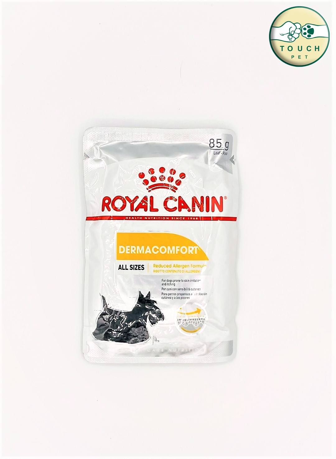 پوچ سگ رویال کنین مدل درما کامفورت با پوست و موی حساس رویال کنین (Royal Canin Dermacomfort Pouch) وزن 85 گرم برای سگ هایی که پوست و موی حساسی دارند، تولید شده است. پوچ درماکامفورت سگ Dermacomfort برای سگ های کوچک با مو و پوست حساس و خارش دار مناسب است. فرمول آن باعث کاهش حساسیت نسبت به مواد حساسیت زا می شود، غنی از پروتیین، امگا 3 و چربی های ضروری است.پوچ رویال کنین درما کامفورت برای سگ نژاد کوچک با پوست و موی حساس شرایطی را با استفاده از مواد غذایی فراهم می کند که مشکلات پوستی از بین بروند و شرایط پوست و مو بهبود یابد. پوست بزرگترین عضوبدن است و حفظ سلامت پوست برای سلامت کلی بدن سگ شما بسیار مهم است. پوست وظایف بسیاری را بر عهده دارد. از بدن محافظت کرده و از خشک شدن آن جلوگیری می کند. همچنین از ورود باکتری های مضر به بدن جلوگیری می کند. پوست چربی ها و ویتامین ها را ذخیره می کند و برای سیستم حسی نقش حیاتی دارد. اگر سگ شما از خشکی پوست، حساسیت و خارش، چربی پوست و یا شوره رنج می برد نشانه ی وجود یک مشکل است. پوچ سگ رویال کنین مدل درما کامفورت حاوی برنج، پروتیین ایزوله شده ی گیاهی، گندم، چربی حیوانی، گلوتن ذرت، جو دو سر، ذرت، پروتین هیدرولیز شده ی حیوانی، مواد معدنی، روغن سویا، خمیر چغندر خشک شده، روغن ماهی، دانه های کتان، فروکتو اولیگو ساکارید ها، مونو و دی گلیسرید پالم و استئاریک اسید همراه با اسید سیتریک، روغن گل گاوزبان و گل مرمری (به عنوان منبع لوتئین).